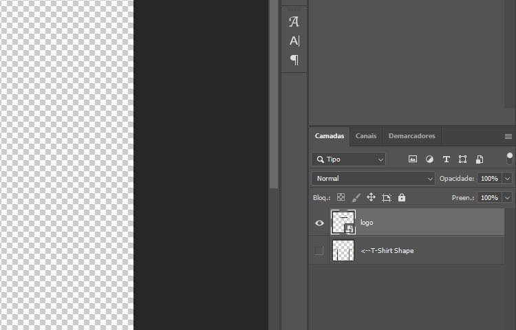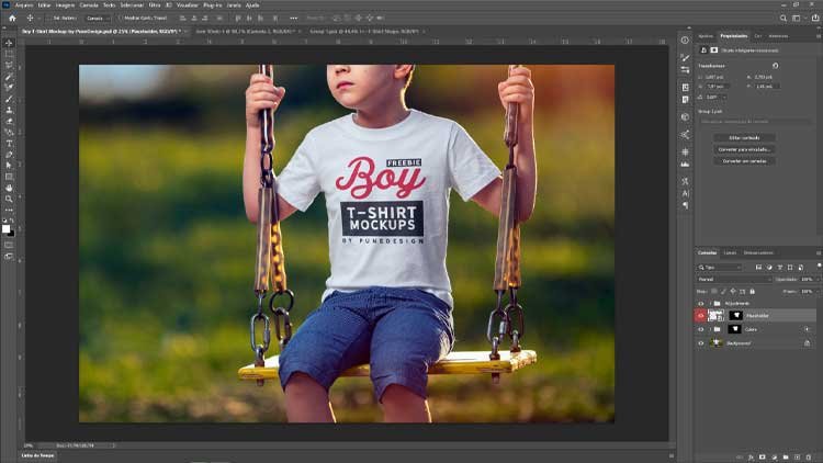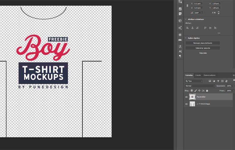 Nesse exemplo, o objeto inteligente é a área disponível dentro da camiseta para que você possa preencher como desejar. Alguns mockups vem com marcações de área, como se fossem marcas de corte, para auxiliar o posicionamento. Nesse mockup, a marcação é uma camada que você pode ligar e desligar.